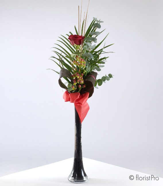A single long stem rose surrounded by luxury foliage and presented in a tall stem vase.