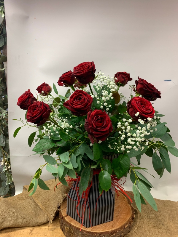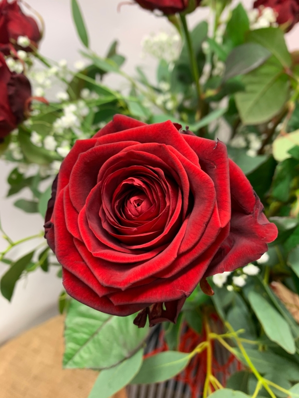 12 red Naomi roses with fresh Isaiah grown eucalyptus and gyp